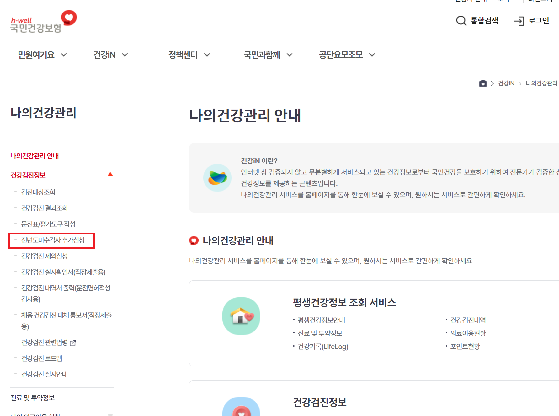 국민건강보험공단 홈페이지에서 '나의 건강관리 > 건강검진 정보 > 전년도 미수검자 추가신청 '을 선택하여 접수 합니다.