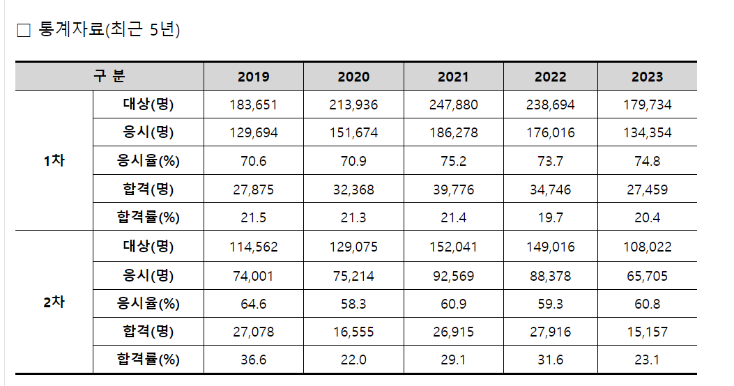• 1차, 2차 시험 모두 매 과목 100점을 만점으로 하여 매 과목 40점 이상, 전 과목 평균 60점 이상 득점한 자