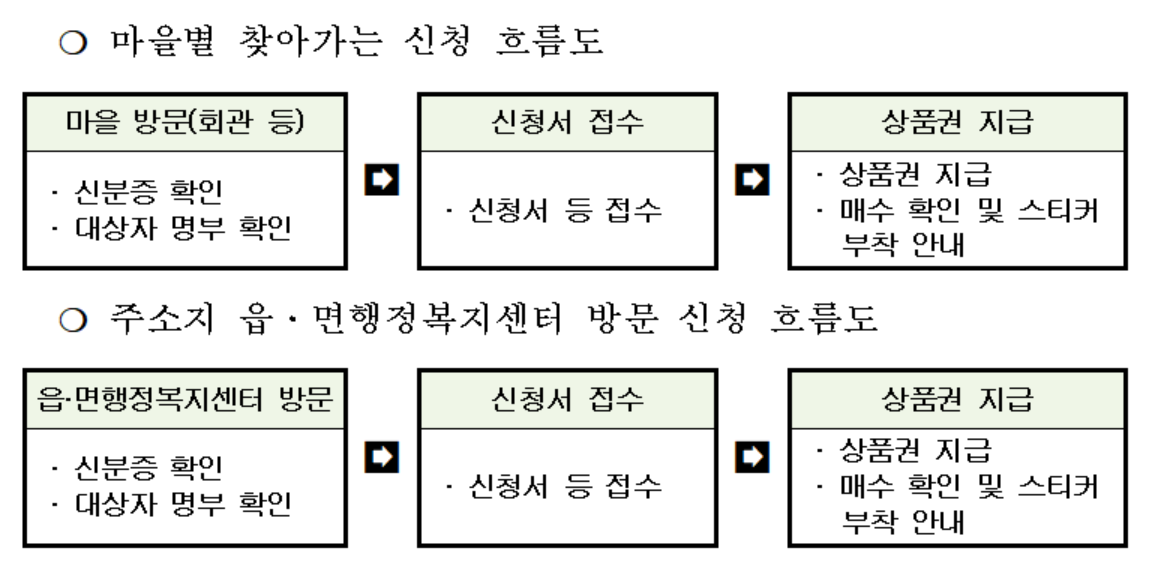 - 5월 2일 ~ 12일: 읍·면 및 부서 직원이 직접 마을 방문하여 접수 및 상품권 지급