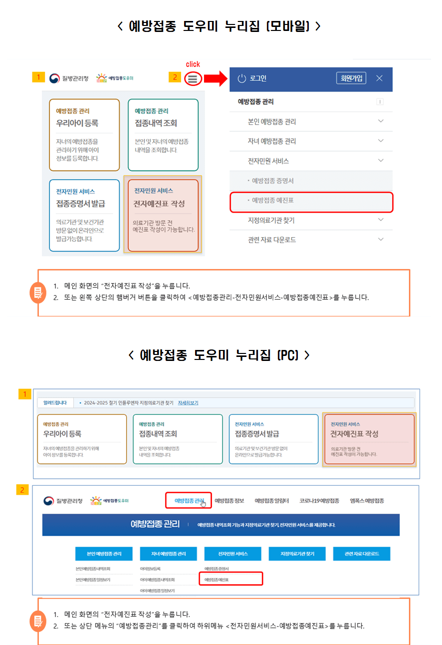 마찬가지로 전자예진표도 예방접종 도우미 누리집에 방문후 (모바일도 가능) 아래와 같이 진행해 주시면 됩니다.