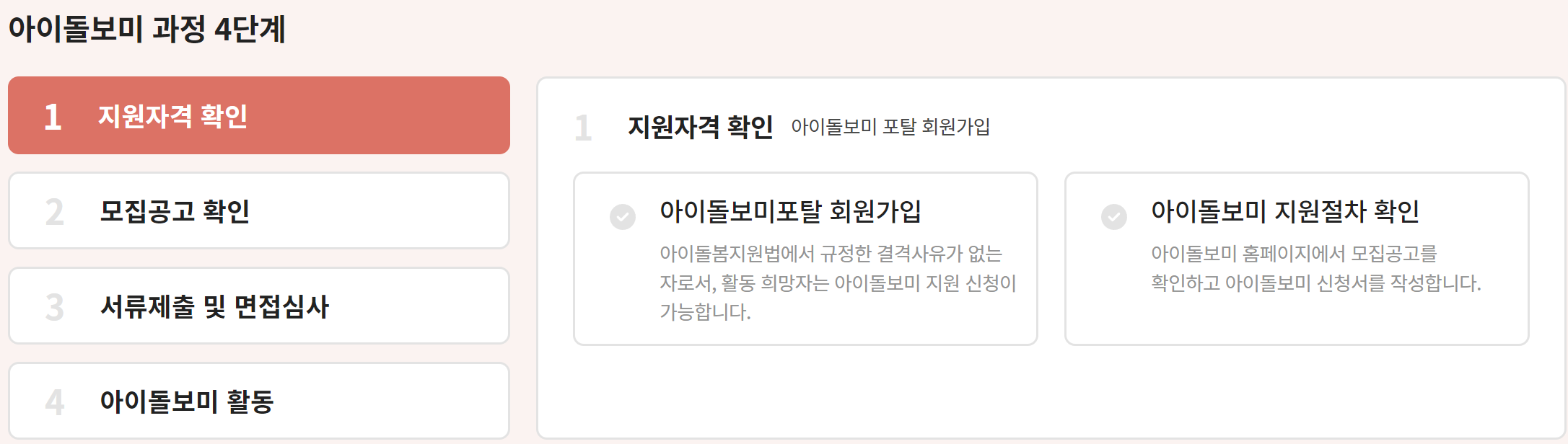 • 아이돌봄지원법에서 규정한 결격사유가 없는 자로서, 활동 희망자는 아이돌보미로 지원신청 가능합니다.
