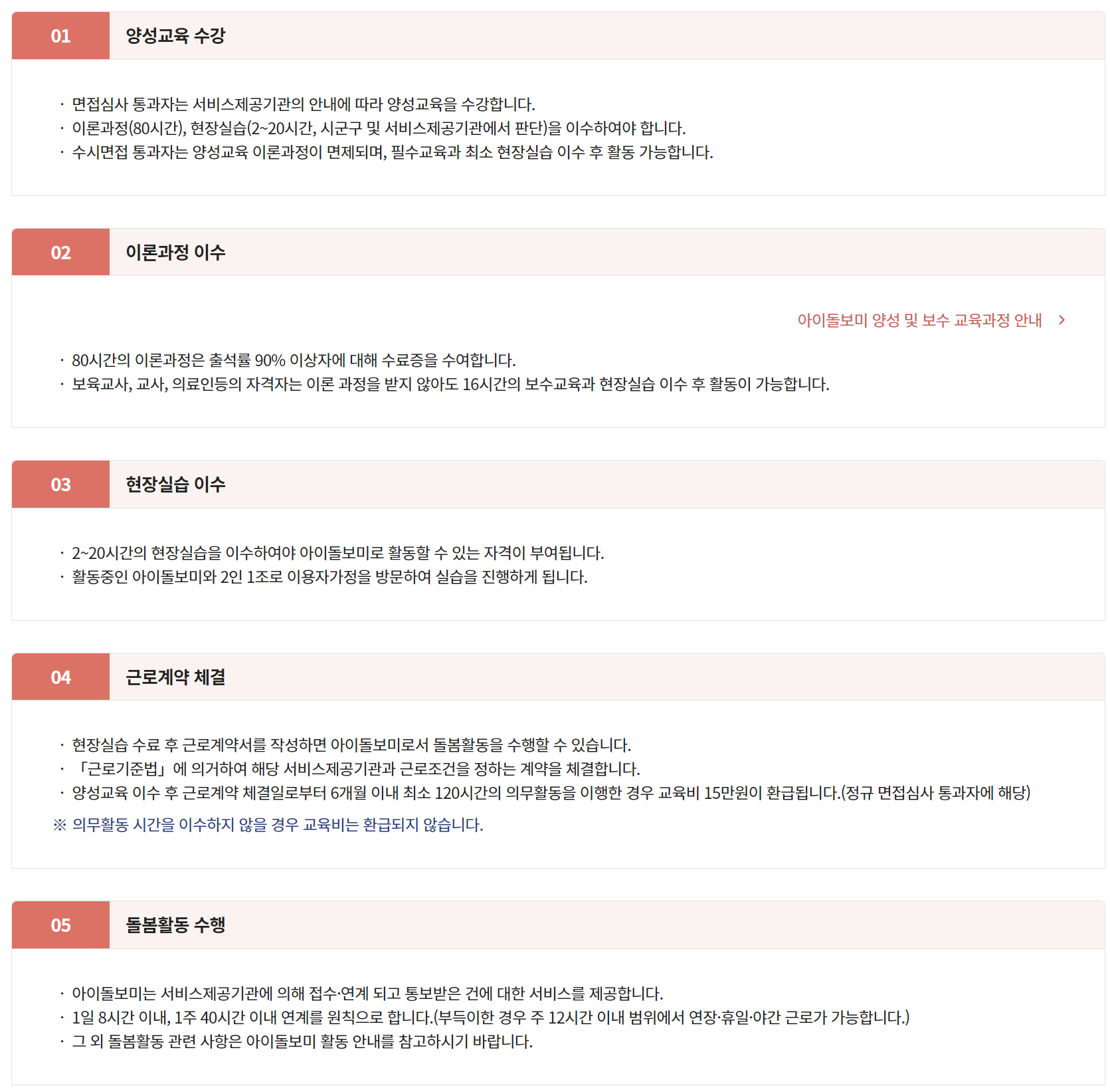 아이돌보미로 지원려면 면접 통과후 양성교육을 수강해야 합니다. 교육에 대한 상세내용은 아래와 같습니다.