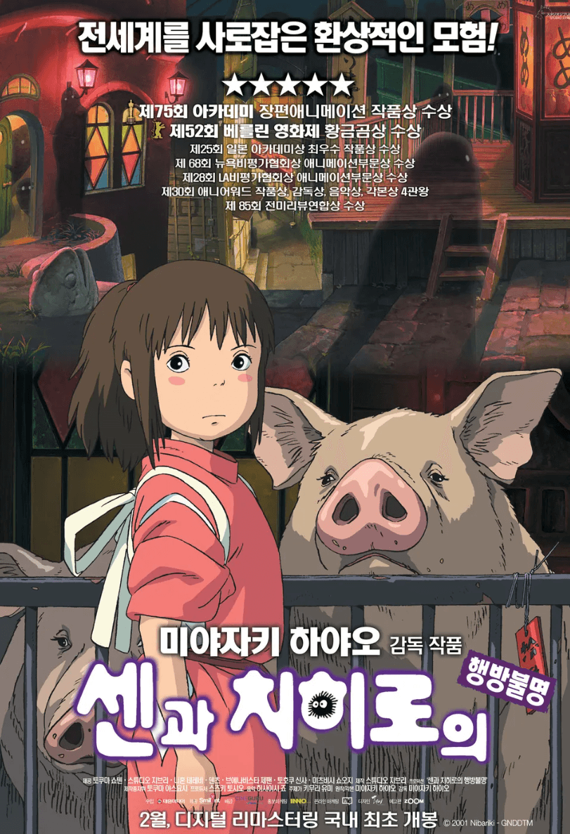 지브리 스튜디오 작품을 거의 다 감상했지만 아무래도 이 작품이 최고라고 말 할 수 있다. 지극히 평범한 소녀의 모험과 용기, 성장을 그린 내용으로 어린아이들에 게도 추천하지만 어른들에게도 꼭 추천하고 싶은 작품이다. 치히로와 주변 인물들의 순수한 마음과 진정성이 결국에는 이기는 작품이다. 캐릭터 얘기도 안 할 수 없는데 희한하게 가오나시 캐릭터가 유명해져서 사람들이 많이 따라 하기도 했었다. 가오나시를 이용해 인간의 탐욕을 보여준 것도 참 씁쓸하지만 잘 보여준 것 같다.그리고 치히로만 변하는 게 아니라 여러 캐릭터들이 각자 성장해 가는 모습도 좋았다. 제75회 아카데미 장편 애니메이션 상을 수상하고 2002년 베를린 영화제 황금곰상도 수상했다. 애니메이션이지만 얼마나 촘촘한 스토리로 만들어진 작품인지 알 수 있다. 옆나라 일본에 애니메이션 제작 능력은 정말 대단한 것 같다. 이 작품은 장면마다 여러 해석이 존재한다. 정답은 없는 것 같다. 보는 사람마다 다양한 해석을 내놓는 작품이기에 몇 번을 보아도 질리지 않고 재밌게 보는 작품이다. 지브리스튜디오에 아직 입문하지 않은 사람이라면 이 작품을 먼저 보고 다른 미야자키 하야오 감독의 작품을 보길 추천한다. 다른 작품도 너무 좋지만 조금 덜 진지하고 사랑스러운 작품이기 때문이다.