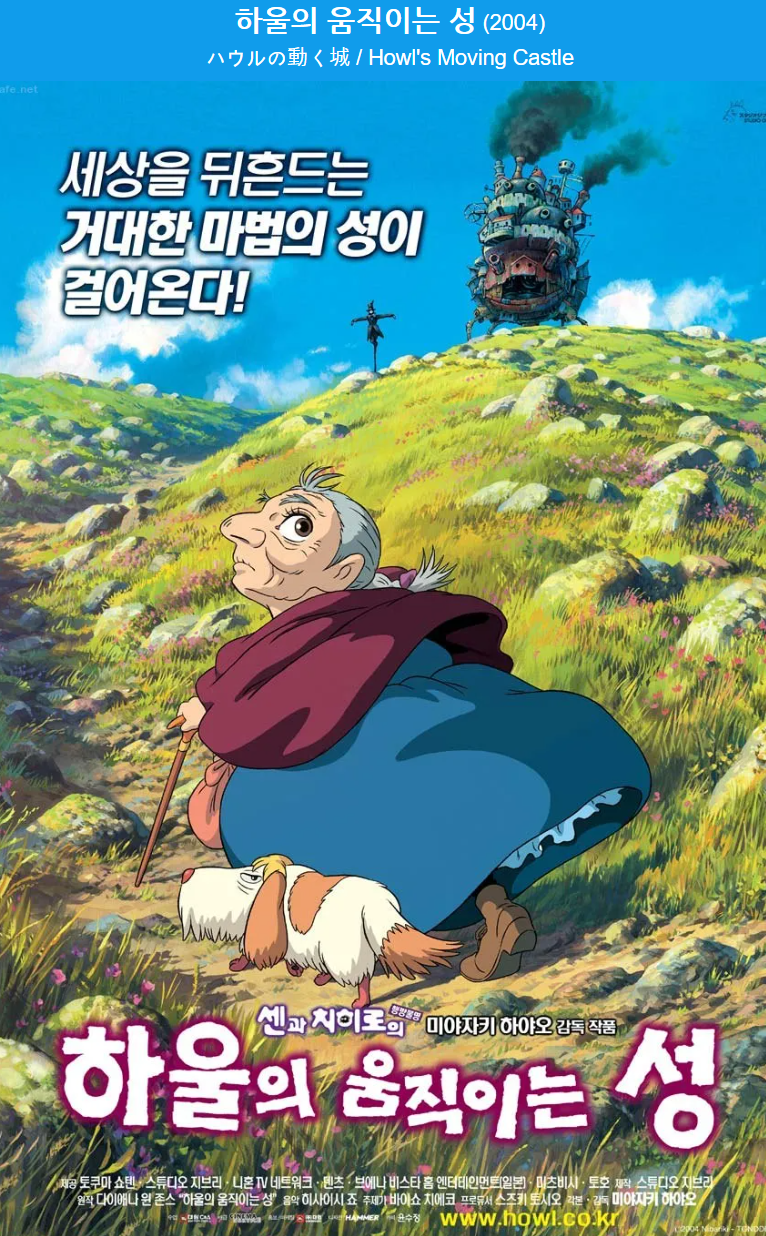 누구나 한 번쯤 꿈꾸는 마법의 세상. 미야자키 하야오의 아름다운 세상이 또다시 열린다. 지브리 스튜디오 작품 중 최고의 꽃미남이 나오는 작품이라 소문난 작품 하울의 움직이는 성 정보와 줄거리, 등장인물, 감상평 알아보겠다.