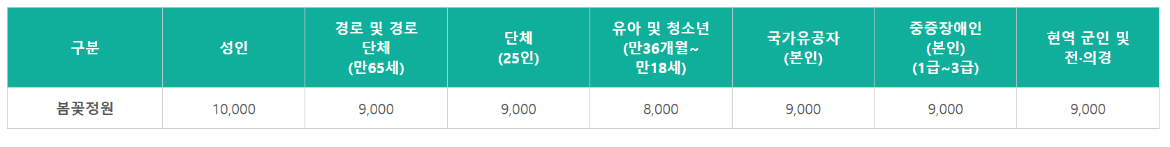 | 구분 | 성인 | 경로 및 경로단체(만65세) | 단체 (25인) |